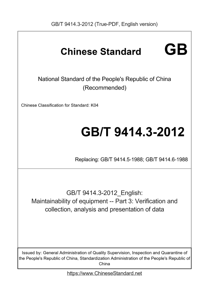 Delivery: <= 3 days. True-PDF full-copy in English will be manually translated and delivered via email. GB/T 9414.3-2012: Maintainability of equipment -- Part 3: Verification and collection, analysis and presentation of data Status: Valid GB/T 9414.3: Historical versions