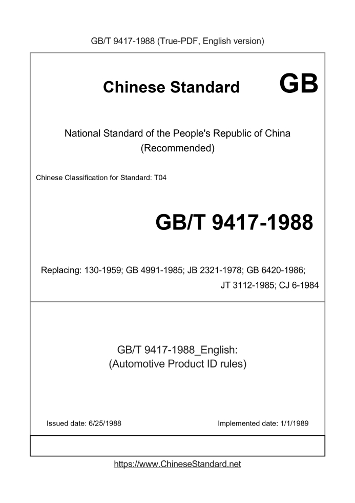 Delivery: <= 2 days. True-PDF full-copy in English will be manually translated and delivered via email. GB/T 9417-1988: (Automotive Product ID rules) Status: Obsolete