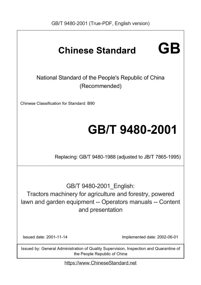 Delivery: <= 3 days. True-PDF full-copy in English will be manually translated and delivered via email. GB/T 9480-2001: Tractors machinery for agriculture and forestry, powered lawn and garden equipment -- Operators manuals -- Content and presentation Status: Valid GB/T 9480: Historical versions