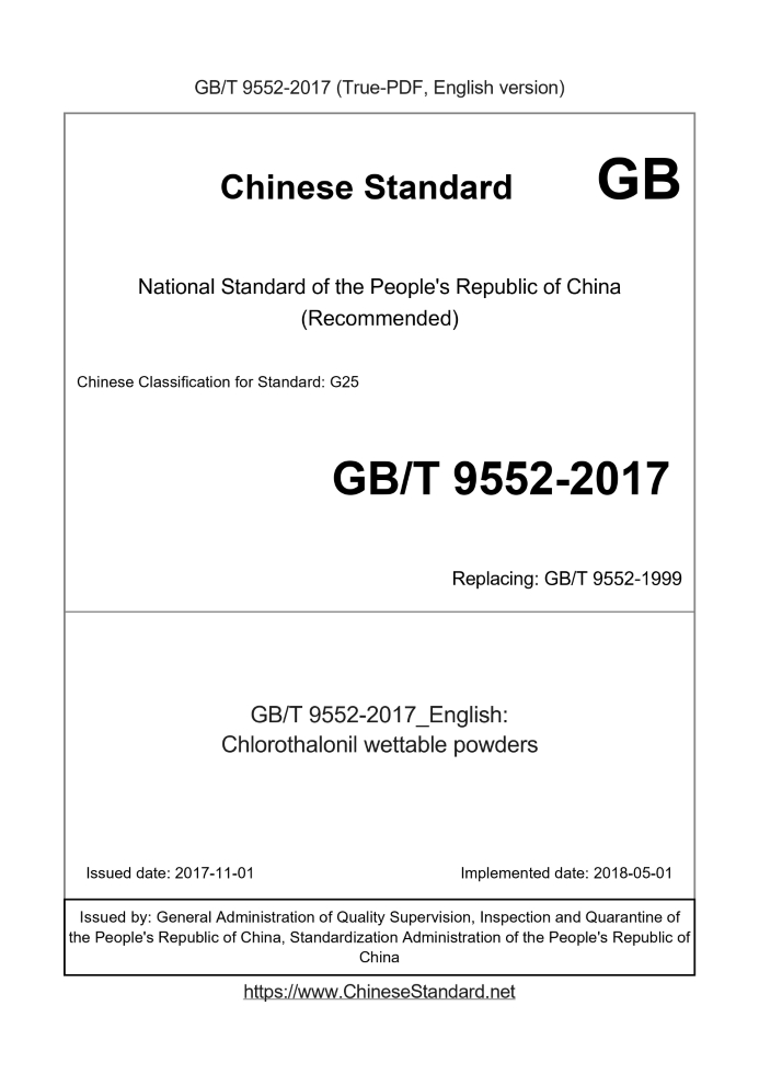 Delivery: <= 3 days. True-PDF full-copy in English will be manually translated and delivered via email. GB/T 9552-2017: Chlorothalonil wettable powders Status: Valid GB/T 9552: Historical versions