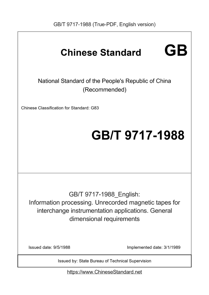 Delivery: <= 2 days. True-PDF full-copy in English will be manually translated and delivered via email. GB/T 9717-1988: Information processing. Unrecorded magnetic tapes for interchange instrumentation applications. General dimensional requirements