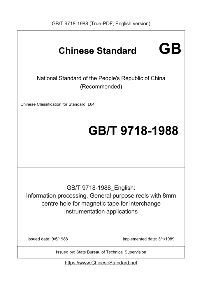 Delivery: <= 2 days. True-PDF full-copy in English will be manually translated and delivered via email. GB/T 9718-1988: Information processing. General purpose reels with 8mm centre hole for magnetic tape for interchange instrumentation applications