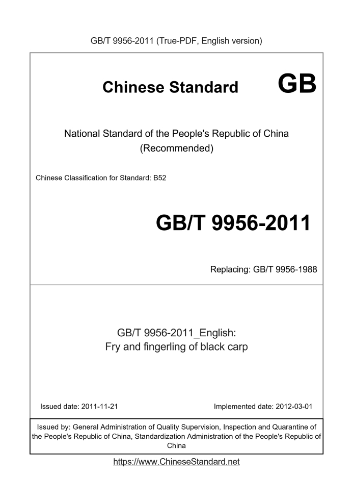 Delivery: <= 3 days. True-PDF full-copy in English will be manually translated and delivered via email. GB/T 9956-2011: Fry and fingerling of black carp Status: Valid GB/T 9956: Historical versions