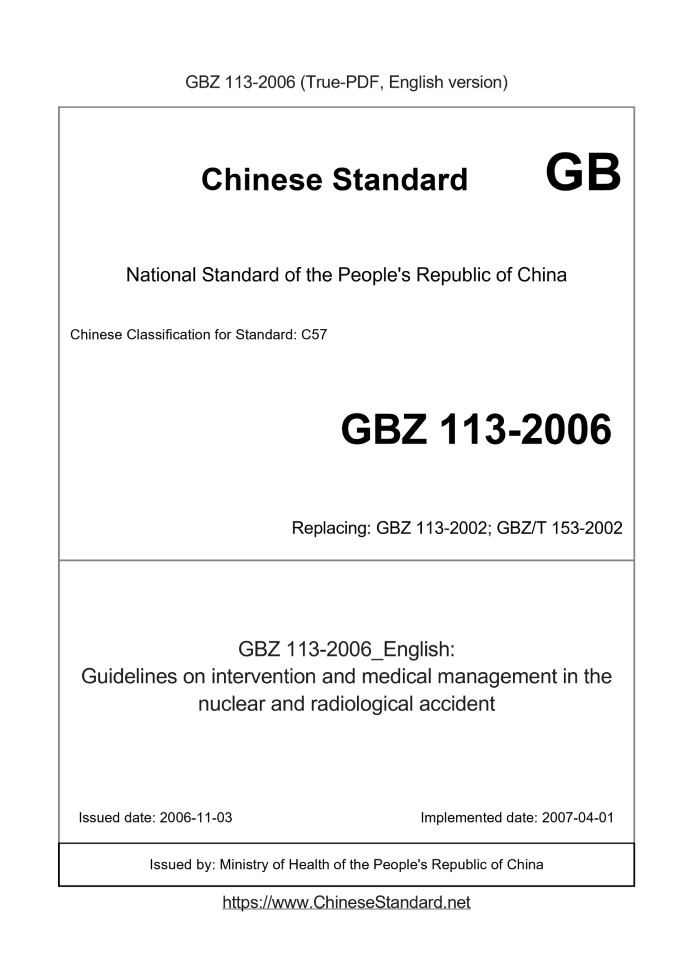 Delivery: <= 4 days. True-PDF full-copy in English will be manually translated and delivered via email. GBZ113-2006: Guidelines on intervention and medical management in the nuclear and radiological accident Status: Obsolete