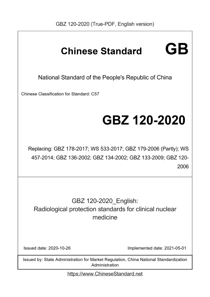 Delivery: <= 10 days. True-PDF full-copy in English will be manually translated and delivered via email. GBZ120-2020: Radiological protection standards for clinical nuclear medicine Status: Valid GBZ120: Historical versions