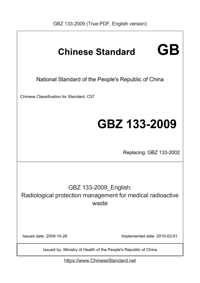 Delivery: <= 3 days. True-PDF full-copy in English will be manually translated and delivered via email. GBZ133-2009: Radiological protection management for medical radioactive waste Status: Obsolete