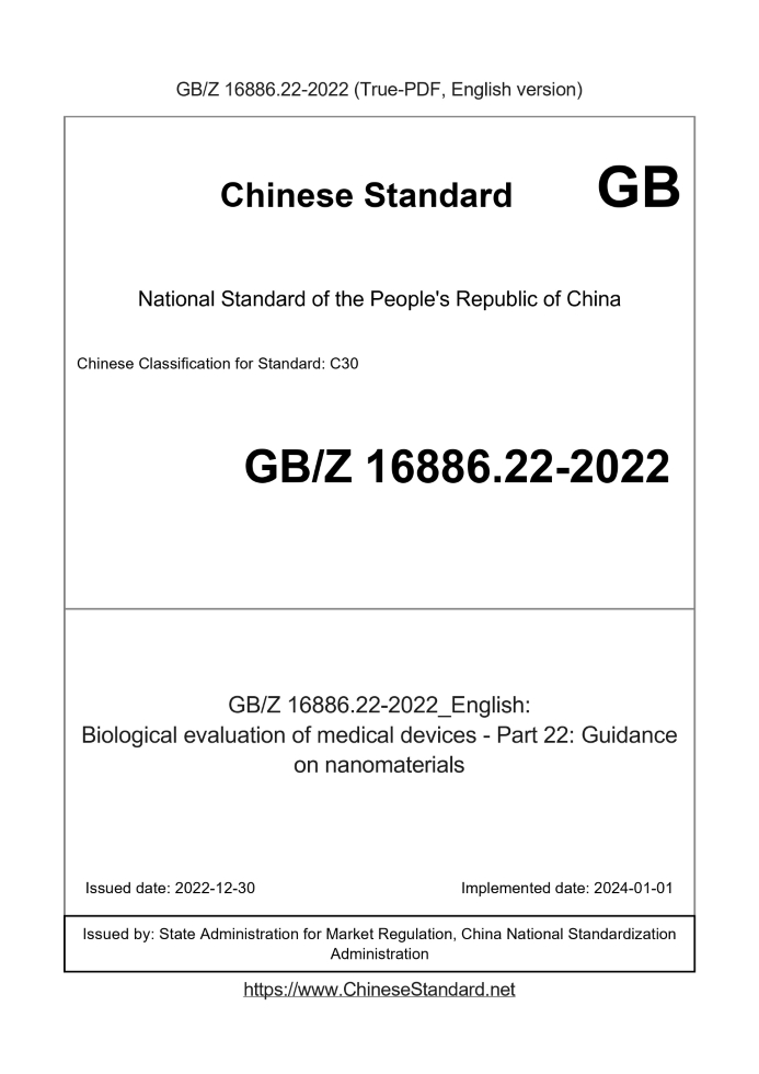 Delivery: <= 8 days. True-PDF full-copy in English will be manually translated and delivered via email. GBZ16886.22-2022: Biological evaluation of medical devices - Part 22: Guidance on nanomaterials Status: Valid