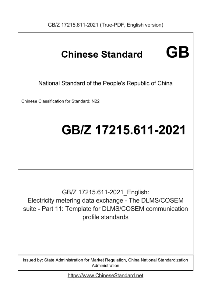 Delivery: <= 3 days. True-PDF full-copy in English will be manually translated and delivered via email. GBZ17215.611-2021: Electricity metering data exchange - The DLMS/COSEM suite - Part 11: Template for DLMS/COSEM communication profile standards Status: Valid
