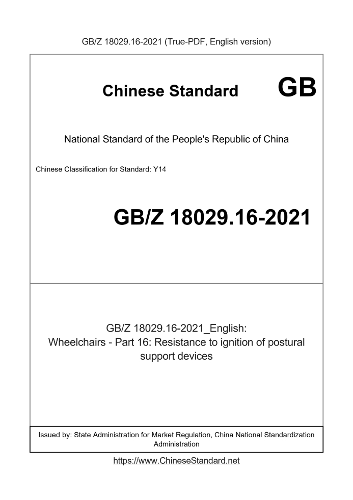 Delivery: <= 3 days. True-PDF full-copy in English will be manually translated and delivered via email. GBZ18029.16-2021: Wheelchairs - Part 16: Resistance to ignition of postural support devices Status: Valid