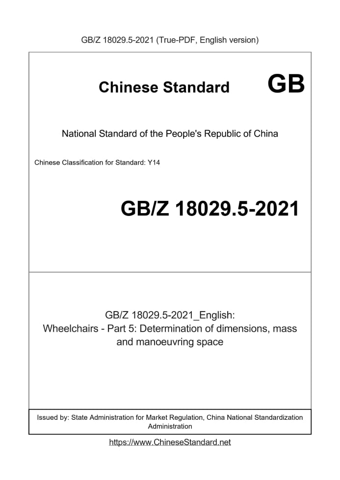 Delivery: <= 6 days. True-PDF full-copy in English will be manually translated and delivered via email. GBZ18029.5-2021: Wheelchairs - Part 5: Determination of dimensions, mass and manoeuvring space Status: Valid