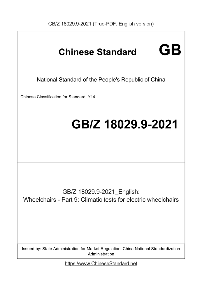 Delivery: <= 3 days. True-PDF full-copy in English will be manually translated and delivered via email. GBZ18029.9-2021: Wheelchairs - Part 9: Climatic tests for electric wheelchairs Status: Valid