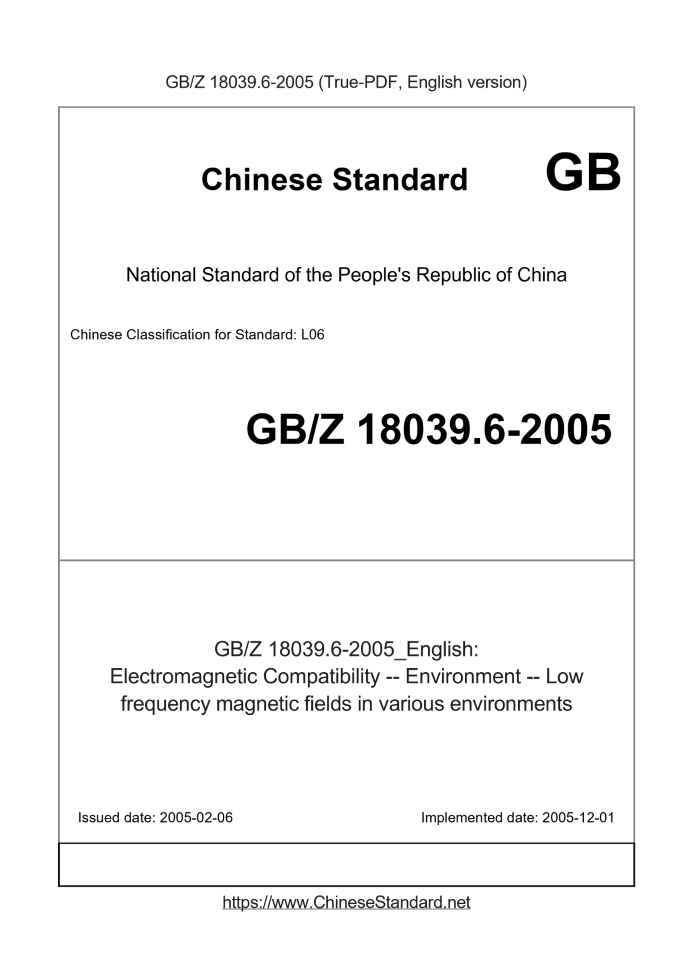 Delivery: <= 4 days. True-PDF full-copy in English will be manually translated and delivered via email. GBZ18039.6-2005: Electromagnetic Compatibility -- Environment -- Low frequency magnetic fields in various environments Status: Valid