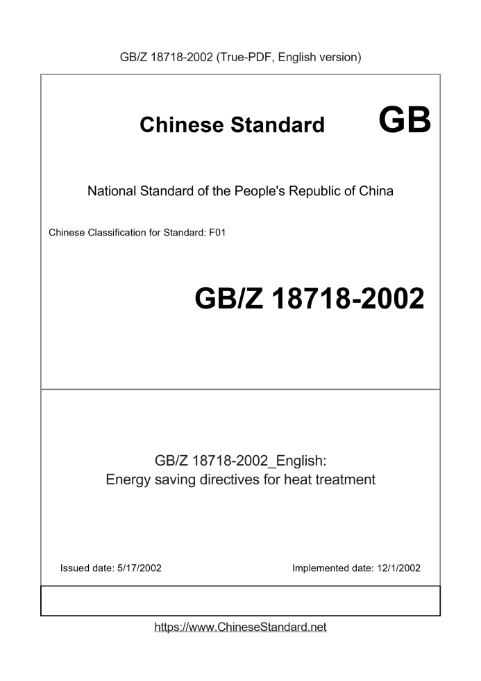 Delivery: <= 3 days. True-PDF full-copy in English will be manually translated and delivered via email. GBZ18718-2002: Energy saving directives for heat treatment Status: Valid