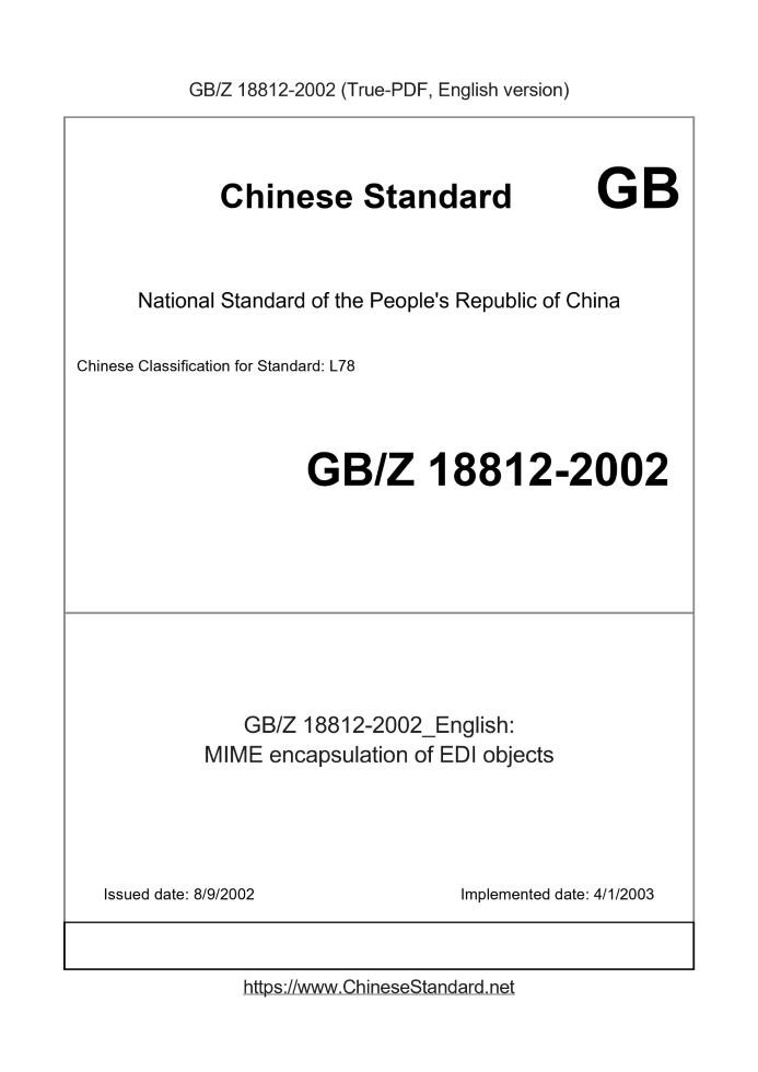 Delivery: <= 3 days. True-PDF full-copy in English will be manually translated and delivered via email. GBZ18812-2002: MIME encapsulation of EDI objects Status: Valid