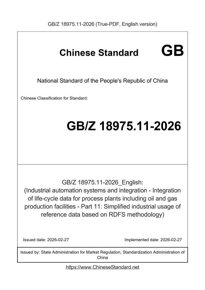 | GB/Z 18975.11-2026 | English | RFQ | ASK | 3 days [Need to translate] | (Industrial automation systems and integration - Integration of life-cycle data for process plants including oil and gas production facilities - Part 11: Simplified industrial usage of reference data based on RDFS methodology) |