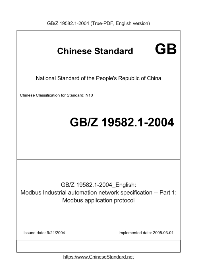 Basic dataStandard ID: GB/Z 19582.1-2004 (GB/Z19582.1-2004)Description (Translated English): Modbus Industrial automation network specification Part 1: Modbus application protocol Sector / Industry: National Standard Classification of Chinese Standard: N10 Classification of International Standard: 25.040 Word Count Estimation: 54,568 Date of Issue: 9/21/2004 Date of Implementation: 2005-03-01 Regulation (derived from): Chinese national standard approved by the announcement in 2004 No. 10 (No. 72 overall) Tips & Frequently Asked Questions:Question 1: How long will the true-PDF of GBZ19582.1-2004_English be delivered?Answer: Upon your order, we will start to translate GBZ19582.1-2004_English as soon as possible, and keep you informed of the progress. The lead time is typically 7 ~ 11 working days. The lengthier the document the longer the lead time.Question 2: Can I share the purchased PDF of GBZ19582.1-2004_English with my colleagues?Answer: Yes. The purchased PDF of GBZ19582.1-2004_English will be deemed to be sold to your employer/organization who actually pays for it, including your colleagues and your employer's intranet.Question 3: Does the price include tax/VAT?Answer: Yes. Our tax invoice, downloaded/delivered in 9 seconds, includes all tax/VAT and complies with 100+ countries' tax regulations (tax exempted in 100+ countries) -- See Avoidance of Double Taxation Agreements (DTAs): List of DTAs signed between Singapore and 100+ countriesQuestion 4: Do you accept my currency other than USD?Answer: Yes. If you need your currency to be printed on the invoice, please write an email to Sales@ChineseStandard.net. In 2 working-hours, we will create a special link for you to pay in any currencies. Otherwise, follow the normal steps: Add to Cart -- Checkout -- Select your currency to pay. |