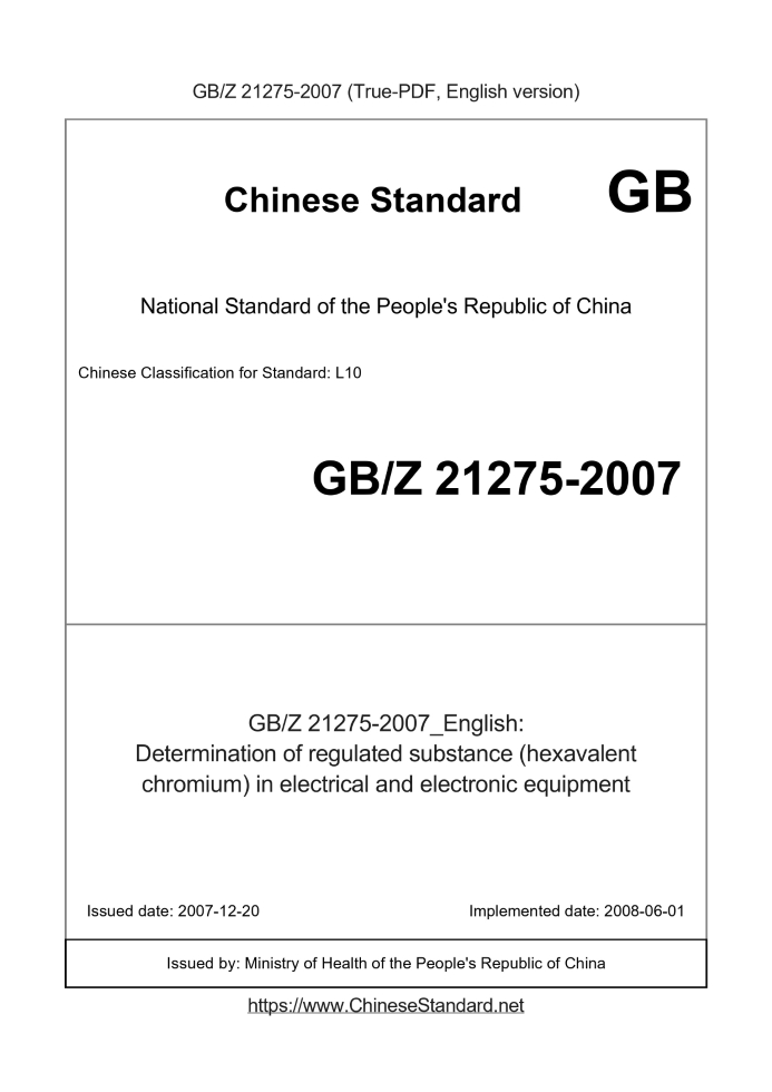 Delivery: <= 3 days. True-PDF full-copy in English will be manually translated and delivered via email. GBZ21275-2007: Determination of regulated substance (hexavalent chromium) in electrical and electronic equipment Status: Obsolete