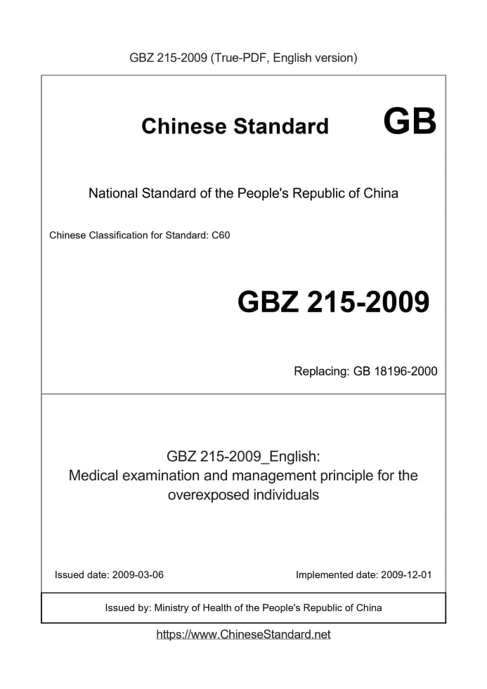 Delivery: <= 3 days. True-PDF full-copy in English will be manually translated and delivered via email. GBZ215-2009: Medical examination and management principle for the overexposed individuals Status: Valid
