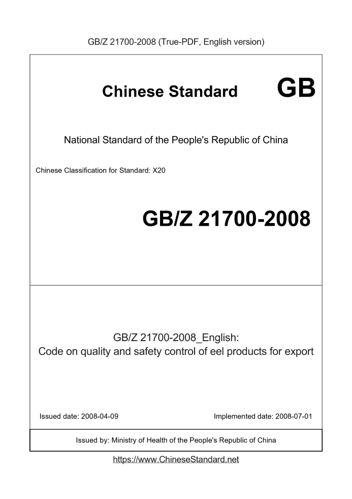 Delivery: <= 3 days. True-PDF full-copy in English will be manually translated and delivered via email. GBZ21700-2008: Code on quality and safety control of eel products for export Status: Valid