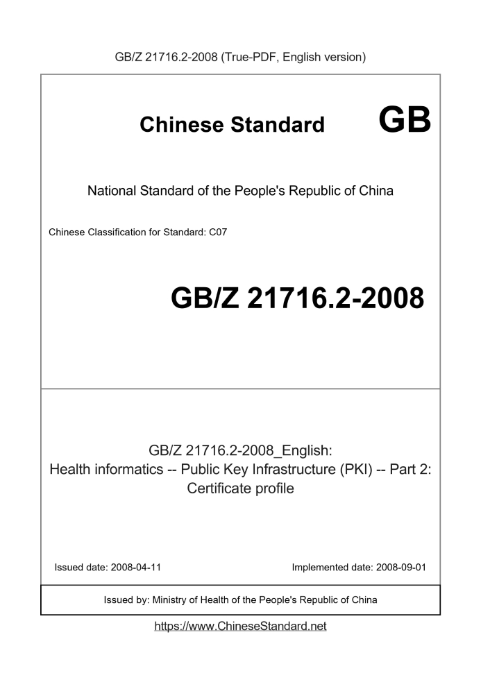 Delivery: <= 6 days. True-PDF full-copy in English will be manually translated and delivered via email. GBZ21716.2-2008: Health informatics -- Public Key Infrastructure (PKI) -- Part 2: Certificate profile Status: Valid
