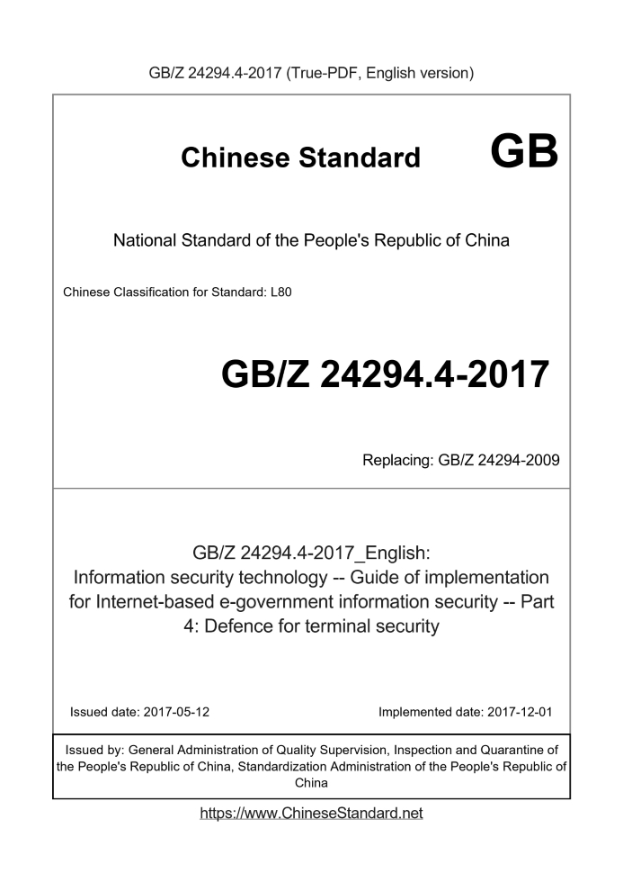 Delivery: <= 3 days. True-PDF full-copy in English will be manually translated and delivered via email. GBZ24294.4-2017: Information security technology -- Guide of implementation for Internet-based e-government information security -- Part 4: Defence for terminal security Status: Valid
