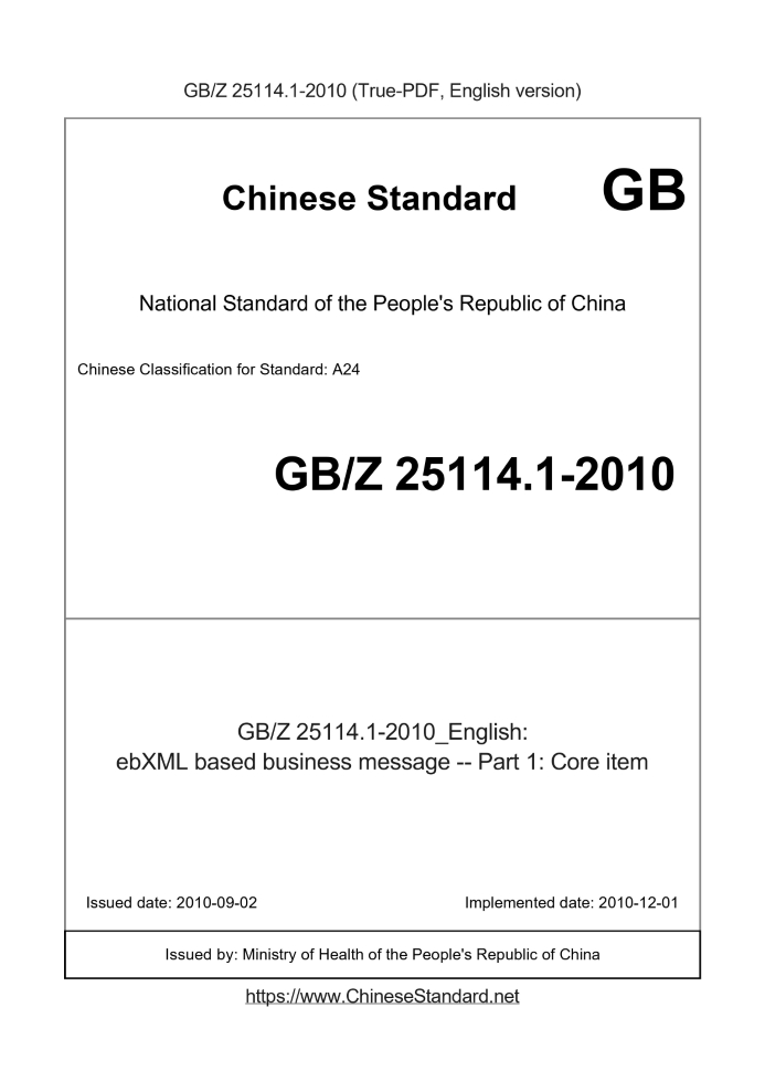 Delivery: <= 6 days. True-PDF full-copy in English will be manually translated and delivered via email. GBZ25114.1-2010: ebXML based business message -- Part 1: Core item Status: Valid