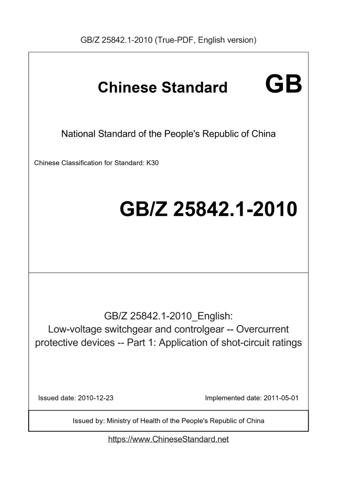 Delivery: <= 3 days. True-PDF full-copy in English will be manually translated and delivered via email. GBZ25842.1-2010: Low-voltage switchgear and controlgear -- Overcurrent protective devices -- Part 1: Application of shot-circuit ratings Status: Valid