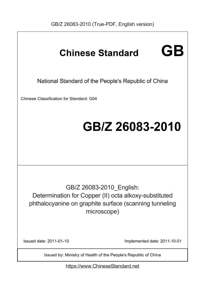 Delivery: <= 3 days. True-PDF full-copy in English will be manually translated and delivered via email. GBZ26083-2010: Determination for Copper (II) octa alkoxy-substituted phthalocyanine on graphite surface (scanning tunneling microscope) Status: Obsolete
