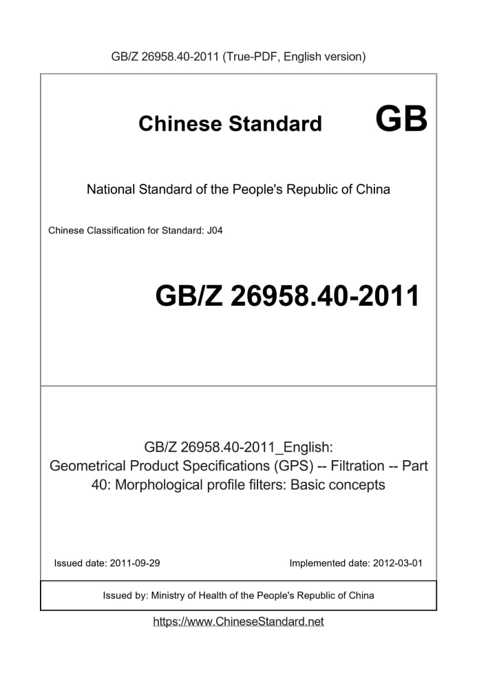 Delivery: <= 3 days. True-PDF full-copy in English will be manually translated and delivered via email. GBZ26958.40-2011: Geometrical Product Specifications (GPS) -- Filtration -- Part 40: Morphological profile filters: Basic concepts Status: Valid