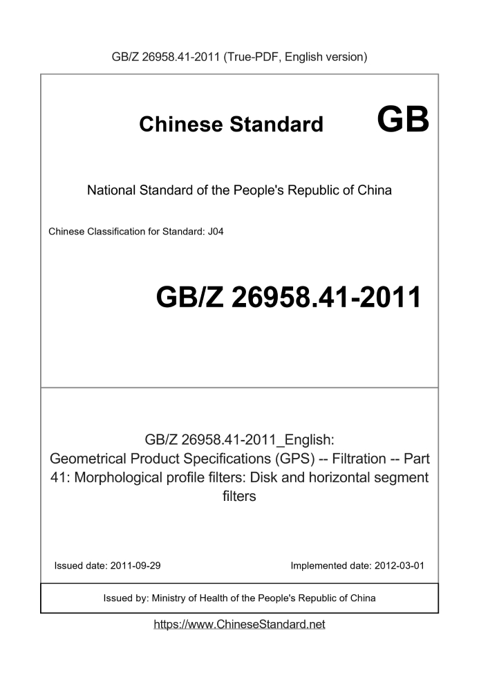 Delivery: <= 3 days. True-PDF full-copy in English will be manually translated and delivered via email. GBZ26958.41-2011: Geometrical Product Specifications (GPS) -- Filtration -- Part 41: Morphological profile filters: Disk and horizontal segment filters Status: Valid