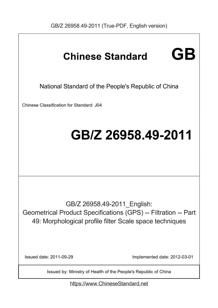 Delivery: <= 3 days. True-PDF full-copy in English will be manually translated and delivered via email. GBZ26958.49-2011: Geometrical Product Specifications (GPS) -- Filtration -- Part 49: Morphological profile filter Scale space techniques Status: Valid