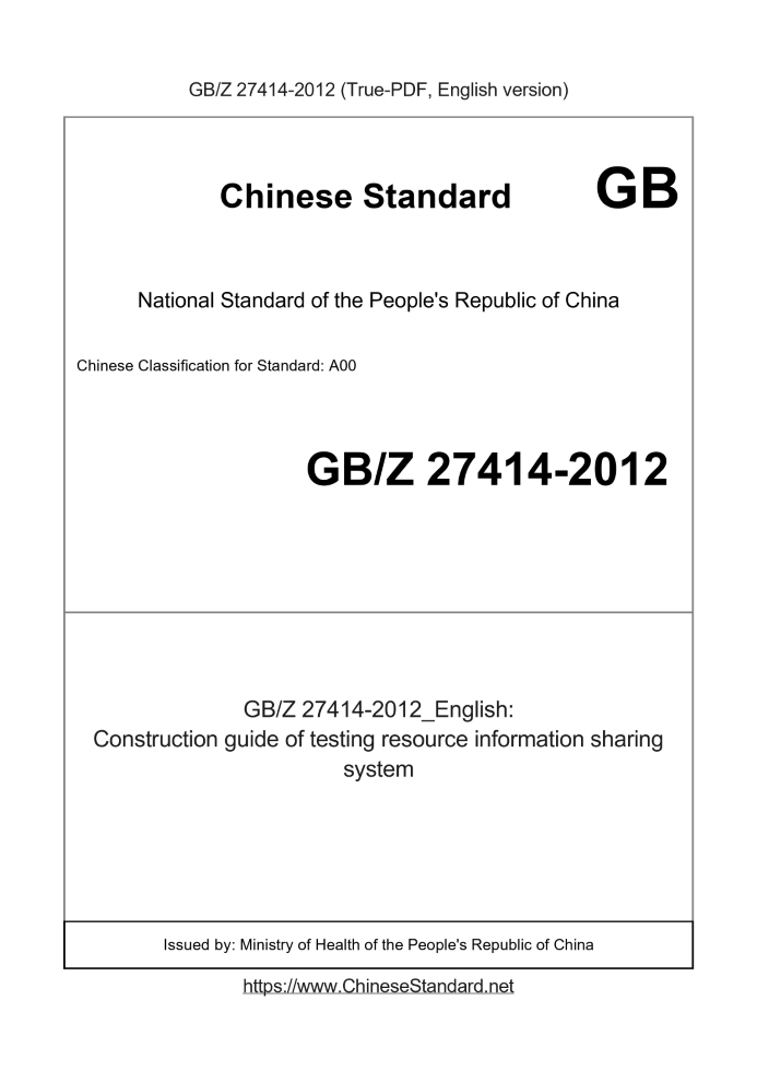 Basic dataStandard ID: GB/Z 27414-2012 (GB/Z27414-2012)Description (Translated English): Construction guide of testing resource information sharing system Sector / Industry: National Standard Classification of Chinese Standard: A00 Classification of International Standard: 35.240 Word Count Estimation: 15,131 Quoted Standard: GB 2312; GB 18030; GB/T 18391-1-2009; GB/T 18391-2-2009; GB/T 18391-3-2009; GB/T 18391-4-2009; GB/T 18391-5-2009; GB/T 18391-6-2009; ISO/IEC TR 14252 Regulation (derived from): National Standards Bulletin 2012 No. 42 Issuing agency(ies): Ministry of Health of the People's Republic of China Summary: This standard specifies the resource information sharing system detects the fundamental principles of its content, sharing, service targets, the overall framework, workflow and technical requirements. This standard applies to all testing resources informa GBZ27414-2012: Construction guide of testing resource information sharing system---This is a DRAFT version for illustration, not a final translation. Full copy of true-PDF in English version (including equations, symbols, images, flow-chart, tables, and figures etc.) will be manually/carefully translated upon your order.Construction guide of testing resource information sharing system ICS 35.240 A00 People's Republic of China national standardization of technical guidance documents Test resource information sharing system construction guide Posted on.2012-12-31 2013-07-01 Implementation General Administration of Quality Supervision, Inspection and Quarantine of People's Republic of China China National Standardization Administration released Directory Preface Ⅰ Introduction Ⅱ 1 Scope 1 2 Normative references 1 3 Terms and definitions 1 4 Abbreviations 3 5 Detection of the basic principles of information sharing system construction 4 6 detection of information sharing system construction content, sharing methods and service targets 4 6.1 Construction Contents 4 6.2 ways to share 5 6.3 clients 5 7 Detection of the overall framework of information sharing system construction 5 8 detection of information sharing system construction workflow and technical requirements 6 8.1 Resource Information Integration 6 8.2 Data Storage 7 8.3 Resource Information Management 8 8.4 Shared Services 8 8.5 Information Security 8 Reference 10 ForewordThis Guidance Document is drafted in accordance with the rules given in GB/T 1.1-2009. The guidance of technical documents by the National Certification and Accreditation Administration certification and accreditation Technical Research Institute. The guidance of technical documents by the National Certification and Accreditation Standardization Technical Committee (SAC/TC261) centralized. The drafting of the guidance of technical documents. Certification and Accreditation Administration Certification and Accreditation Institute, Chinese Academy of Sciences Machine Network Information Center, Certification and Accreditation Administration of China Information Center. The main drafters of this technical document are Qiao Dong, Li Jianhui, Xiao Liang, Hu Lianglin, Wang Hai, Yin Chuanru, Xie Cheng, Tao Yufeng, Tan Xiaodong, Su Zhiming, Jin Guojian, Liu Xi, Zheng Yi Long.IntroductionTesting is an important part of national scientific and technological work and scientific research and innovation activities, and an important task related to national economy and the people's livelihood. Detect resources Information is the basic guarantee to ensure the accuracy of scientific research and the reliability of scientific research conclusion, as well as to improve product quality and safeguard public interest Building an equitable society and government administration and management of the important technical basis for the detection work is carried out effectively support and protection. To make a huge number, distribution Scattered detection resources to maximize the use of information, the use of advanced computer, Internet and other information technology to build detection of information resources Sharing system, in order to achieve the detection of information sharing resources this important measure. In recent years, the experience of informatization construction and resource information sharing projects both at home and abroad shows that standard norm is important for resource information sharing basis. Standards and standards are based on the wisdom of all parties involved in the field to complete, is a collective consensus on the work content, methods, goals of the field. its Implementation can be unified implementation, improve work efficiency and construction quality, reduce resource information integration, integration, service costs. Therefore, standardized Detecting the construction of resource information sharing is the key to the smooth construction and operation of resource sharing system. Detection of information sharing system construction All relevant departments and units can be implemented under the guidance of this standard detection of resource information sharing system Construction. Test resource information sharing system construction guide1 ScopeThis standard specifies the basic principles of testing the construction of information sharing system, the content of construction, sharing methods, service targets, the overall framework, Workflow and technical requirements. This standard applies to all test resource information sharing system.2 Normative referencesThe following documents for the application of this document is essential. For dated references, only the dated version applies to this article Pieces. For undated references, the latest edition (including all amendments) applies to this document. GB 2312 Information exchange with Chinese character encoding character set basic set GB 18030 information technology exchange of information using Chinese character set expansion of the basic character set GB/T 18391-2009 (all parts) Information Technology Metadata Registration Sys