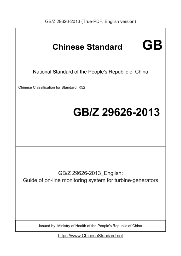 Basic dataStandard ID: GB/Z 29626-2013 (GB/Z29626-2013)Description (Translated English): Guide of on-line monitoring system for turbine-generators Sector / Industry: National Standard Classification of Chinese Standard: K52 Classification of International Standard: 29.160.40 Word Count Estimation: 34,322 Quoted Standard: GB/T 191; GB/T 2423.1; GB/T 2423.2; GB/T 2423.4; GB/T 2423.10; GB 3836.1; GB/T 4798.1; GB/T 4798.2; GB/T 17626.2; GB/T 17626.3; GB/T 17626.4; GB/T 17626.5; GB/T 17626.8; GB/T 17799.2; GB/T 17799.4 Regulation (derived from): National Standards Bulletin 2013 No. 10 Issuing agency(ies): Ministry of Health of the People's Republic of China Summary: This standard specifies: turbo-generator line Monitoring System for a variety of devices basic technical conditions, general requirements, reliability requirements, acceptance of technical conditions, the design principle of selection, communication proto GBZ29626-2013: Guide of on-line monitoring system for turbine-generators---This is a DRAFT version for illustration, not a final translation. Full copy of true-PDF in English version (including equations, symbols, images, flow-chart, tables, and figures etc.) will be manually/carefully translated upon your order.Guide of on-line monitoring system for turbine-generators ICS 29.160.40 K52 People's Republic of China national standardization of technical guidance documents Turbine status online monitoring system Application Guidelines 2013-07-19 released 2013-12-02 Implementation General Administration of Quality Supervision, Inspection and Quarantine of People's Republic of China China National Standardization Administration released Directory Foreword Ⅲ Introduction IV 1 Scope 1 2 Normative references 1 3 Terms and definitions 2 4 online monitoring general requirements 3 5 Turbine Generator Online Monitoring Project 4 6 online monitoring system inspection, acceptance and verification 6 7 logo, packaging, transportation and storage 7 Completeness of supply 8 Appendix A (Informative) Generator fault location and features 9 Appendix B (Informative) Turbine - generator stator winding end vibration monitoring system Appendix C (informative) Partial discharge online monitoring 13 Appendix D (Informative) Turbine Rotor On-line Short-circuit Monitoring 18 Appendix E (Informative) Insulation over-temperature alarm 22 Appendix F (Informative) Turbine Generator Shaft Torsional Vibration Online Monitoring System 25 ForewordThis instructional document has been drafted in accordance with the rules given in GB/T 1.1-2009. This guidance document is proposed by China Electrical Equipment Industry Association. This guidance document is organized by the National Large Scale Generator Standardization Technical Committee (SAC/TC511). The main drafting of the technical guidance of this document. Shandong Electric Power Research Institute, North China Electric Power Research Institute Co., Ltd., East China Electric Power Experimental Research Institute Co., Ltd., Harbin Institute of Electrical Engineers, Liaoning Provincial Electric Power Co., Ltd. Electric Power Research Institute, Anhui Electric Power Research Institute Institute, Guangdong Yuedian Group Co., Ltd. The guidance of technical documents to participate in the drafting unit. Beijing North Heavy Turbine Co., Ltd., Shandong Qilu Electric Manufacturing Co., Ltd., Dongfang Electric Co., Ltd., Shanghai Electric Power Station Equipment Co., Ltd., Beijing Sifang Automation Co., Ltd., Shanghai Jiaotong University, North Jinghua Branch Tongan Monitoring Technology Co., Ltd., Guangzhou Hao Electric Automation Co., Ltd., Shanghai Habitat Technology Co., Ltd., Germany (Shandong) Electric Force limited technology division. The main drafters of this technical document are Sun Shumin, Bai Yamin, Bai Kai, Li Fuxing, Sun Yutian, Wang Jianjun, Sheng Mingjun, Ye Guohua, Wang Anton, Cao Zhiwei, Cheng Yan. The guidance of technical documents to participate in the drafters. Zhuge Wenbing, Zhang Zhonghai, Wang Yong, Liu Mingxing, Tian Jian, Jiang Xiuchen, Zhu Yuliang, He Wenwei, Guo Weiqin, Bai Xueyan, Zhou Hang.IntroductionWith the increase of generators' stand-alone capacity, the impact of large generator faults on power generation companies and power grids is increasing. In order to be shipped Line monitoring the status of the generator, the generator may predict the failure and monitor the development process, all kinds of on-line monitoring device in the turbine power The machine has been promoted and applied. At present, most of the generator online monitoring equipment in addition to manufacturers standards there is no uniform standard can be based. user, Design department, manufacturing department of the generator monitoring system may exist different understanding and misunderstanding, the generator online monitoring equipment performance Parameters, measurement methods are not uniform, the reliability of monitoring equipment, monitoring sensitivity difference is not conducive to the formation of a unified criterion, it is difficult to Guiding the operation and maintenance of the generator by the ground led to the extension of many of the equipment failures that could have been discovered and avoided in advance to even recurrences. The purpose of this guidance document is to guide the selection, design, installation and operation of generator monitoring equipment. Turbine status online monitoring system Application Guidelines1 ScopeThis Guidance Document stipulates the basic technical conditions, requirements and reliability of various devices for on-line monitoring system of steam turbine condition Sexual requirements, acceptance of technical conditions, design selection principles, communication protocols and power plant distributed control system DCS (DistributedControlSys- tem) connection requirements. This Guidance Document is applicable to Turbine Generator Online Monitoring System (hereinafter referred to as Monitoring System).2 Normative referen