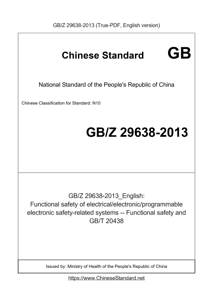 Delivery: <= 3 days. True-PDF full-copy in English will be manually translated and delivered via email. GBZ29638-2013: Functional safety of electrical/electronic/programmable electronic safety-related systems -- Functional safety and GB/T 20438 Status: Valid