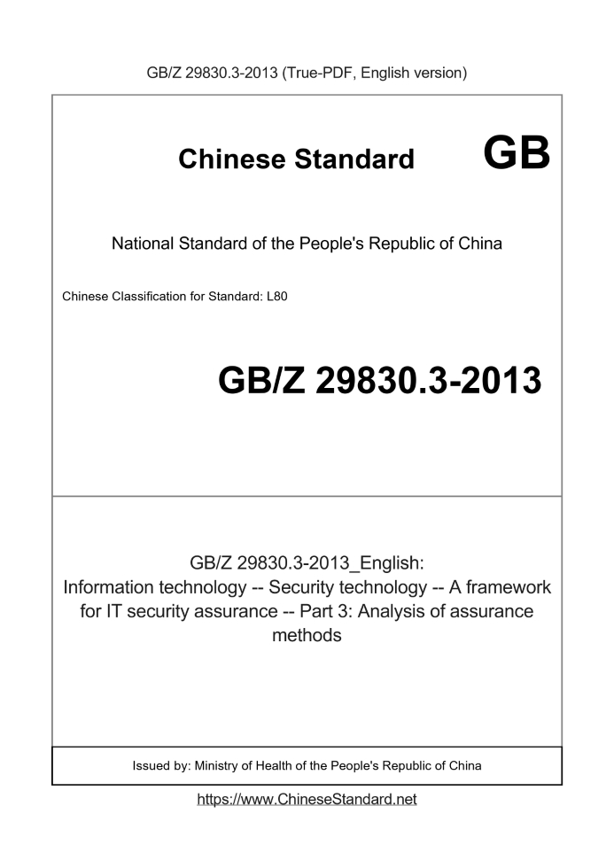 Delivery: <= 6 days. True-PDF full-copy in English will be manually translated and delivered via email. GBZ29830.3-2013: Information technology -- Security technology -- A framework for IT security assurance -- Part 3: Analysis of assurance methods Status: Valid
