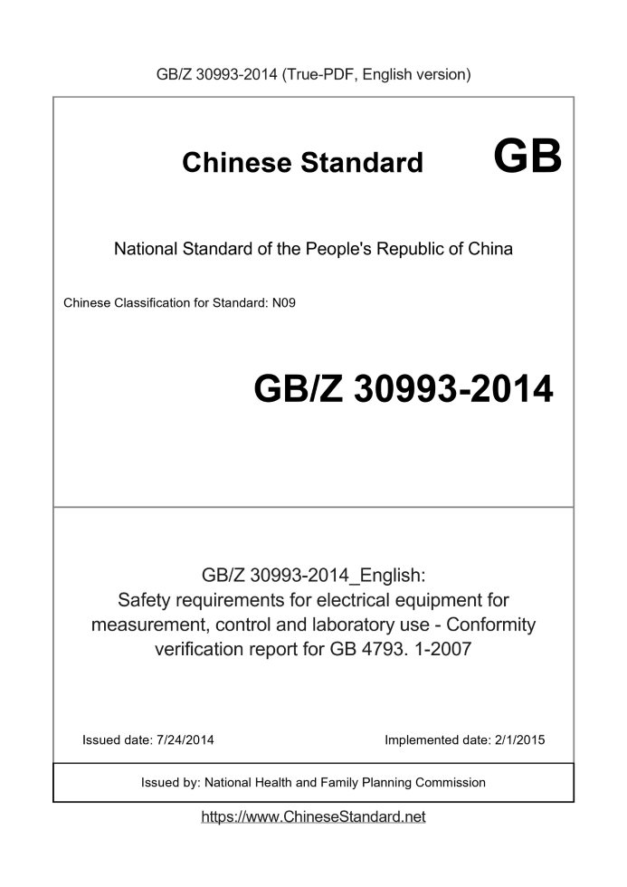 Delivery: <= 10 days. True-PDF full-copy in English will be manually translated and delivered via email. GBZ30993-2014: Safety requirements for electrical equipment for measurement, control and laboratory use - Conformity verification report for GB 4793. 1-2007 Status: Valid