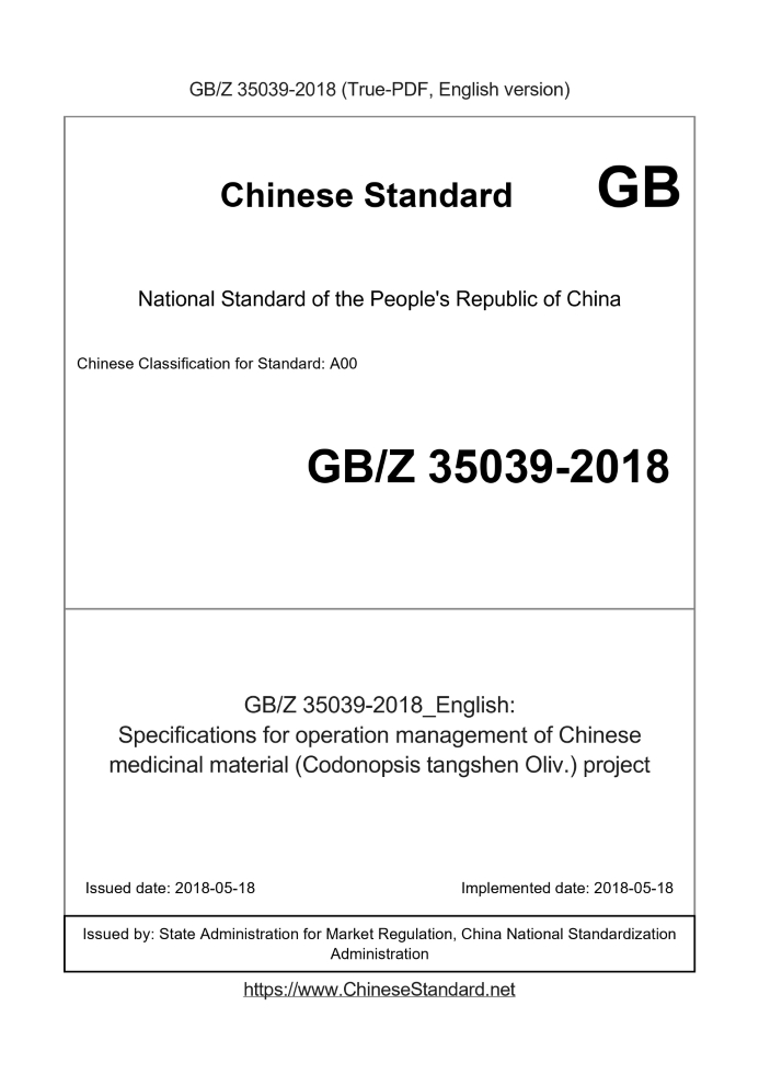 Delivery: <= 4 days. True-PDF full-copy in English will be manually translated and delivered via email. GBZ35039-2018: Specifications for operation management of Chinese medicinal material (Codonopsis tangshen Oliv.) project Status: Valid
