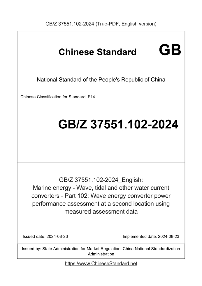 Delivery: <= 5 days. True-PDF full-copy in English will be manually translated and delivered via email. GBZ37551.102-2024: Marine energy - Wave, tidal and other water current converters - Part 102: Wave energy converter power performance assessment at a second location using measured assessment data Status: Valid