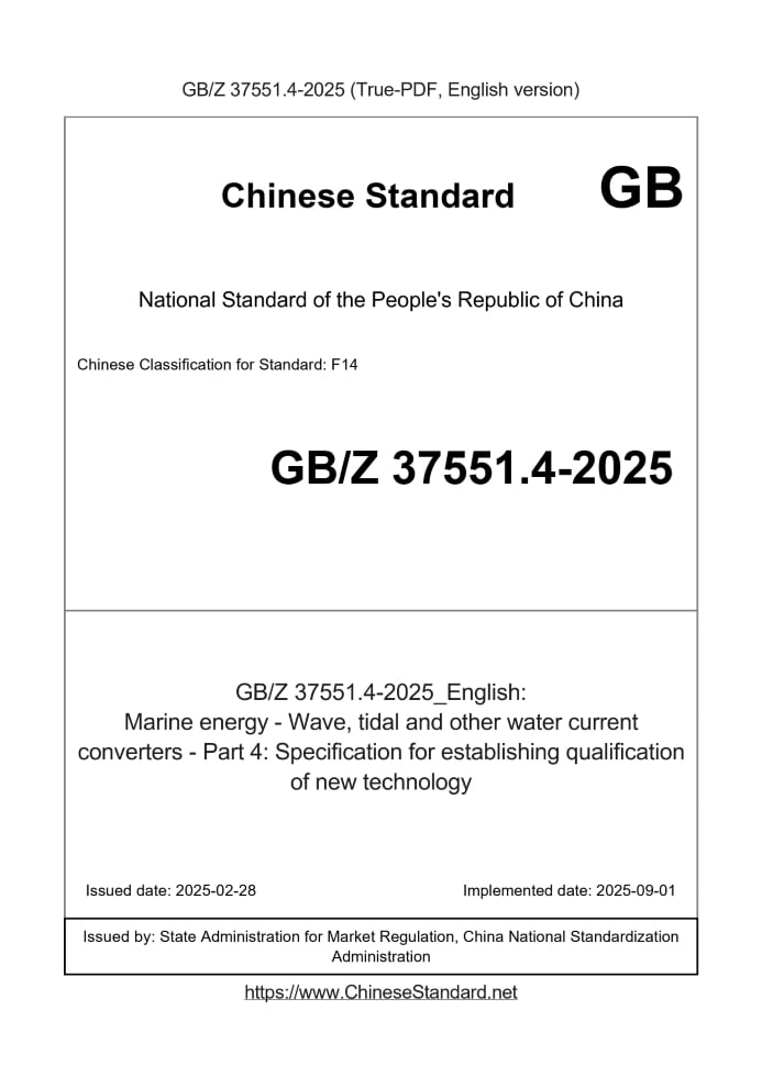 Delivery: <= 5 days. True-PDF full-copy in English will be manually translated and delivered via email. GBZ37551.4-2025: Marine energy - Wave, tidal and other water current converters - Part 4: Specification for establishing qualification of new technology Status: Valid