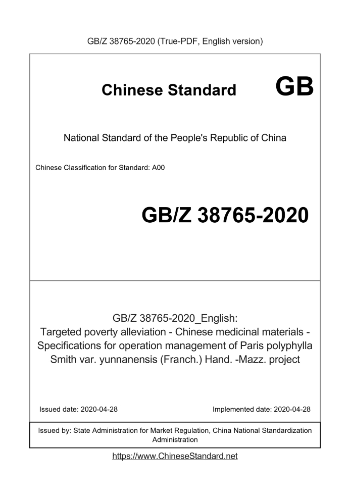 Delivery: <= 5 days. True-PDF full-copy in English will be manually translated and delivered via email. GBZ38765-2020: Targeted poverty alleviation - Chinese medicinal materials - Specifications for operation management of Paris polyphylla Smith var. yunnanensis (Franch.) Hand. -Mazz. project Status: Valid