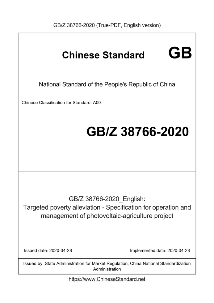 Delivery: <= 4 days. True-PDF full-copy in English will be manually translated and delivered via email. GBZ38766-2020: Targeted poverty alleviation - Specification for operation and management of photovoltaic-agriculture project Status: Valid