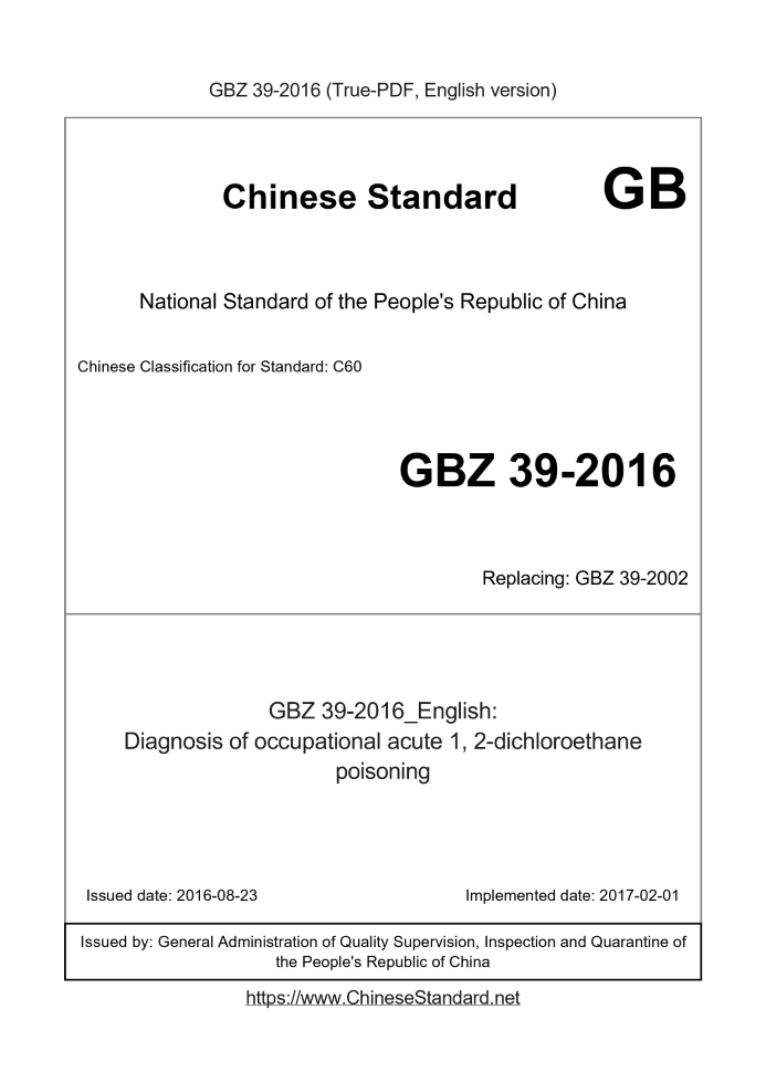 Delivery: <= 3 days. True-PDF full-copy in English will be manually translated and delivered via email. GBZ39-2016: Diagnosis of occupational acute 1, 2-dichloroethane poisoning Status: Valid GBZ39: Historical versions