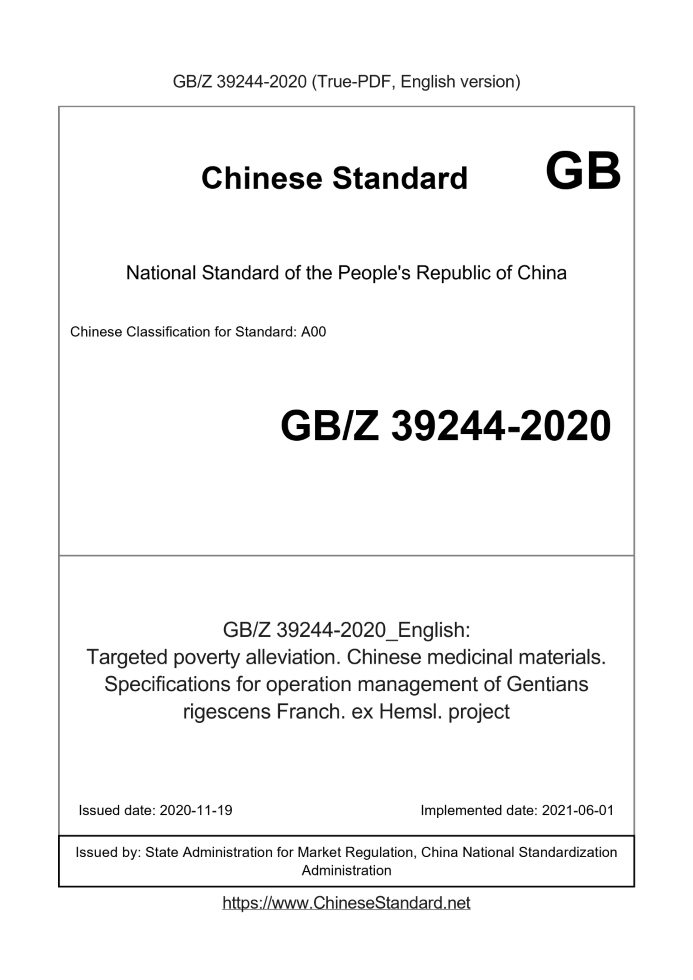 Delivery: <= 4 days. True-PDF full-copy in English will be manually translated and delivered via email. GBZ39244-2020: Targeted poverty alleviation. Chinese medicinal materials. Specifications for operation management of Gentians rigescens Franch. ex Hemsl. project Status: Valid