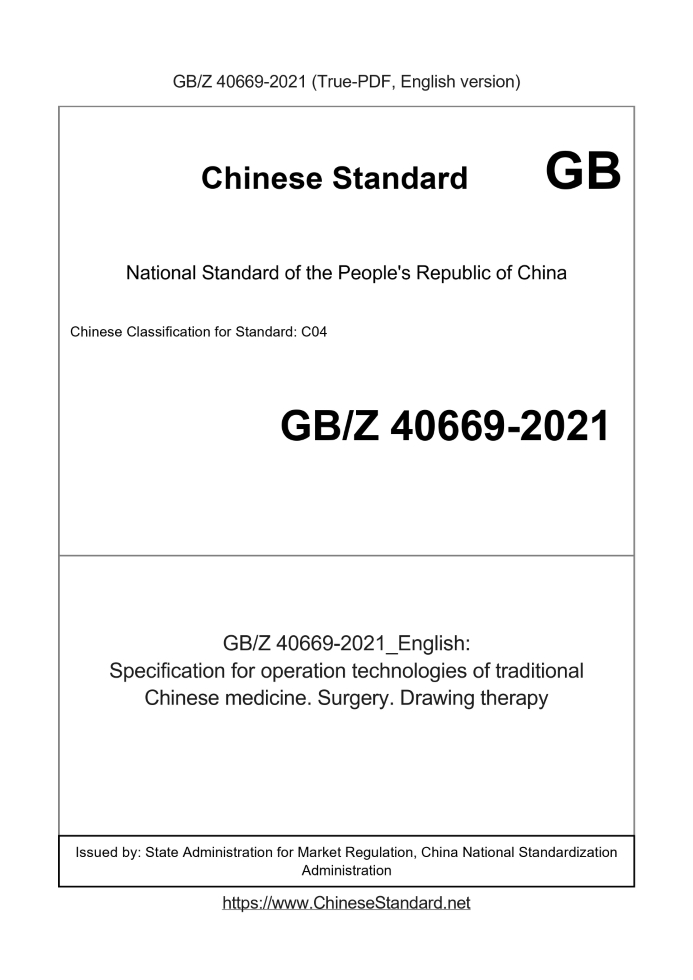 Delivery: <= 3 days. True-PDF full-copy in English will be manually translated and delivered via email. GBZ40669-2021: Specification for operation technologies of traditional Chinese medicine. Surgery. Drawing therapy Status: Valid