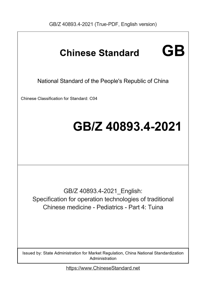 GB /Z 40893.4-2021 Specification for operation technologies of traditional Chinese medicine - Pediatrics - Part 4.Tuina ICS 11.020 CCSC04 National Standardization Guiding Technical Documents of the People's Republic of China Traditional Chinese Medicine Technical Code of Practice for Pediatrics Part 4.Pediatric Tuina Therapy Released on 2021-11-26 2021-11-26 implementation State Administration for Market Regulation Issued by the National Standardization Management Committee