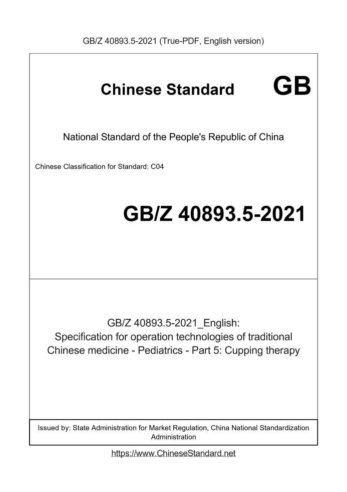 Delivery: <= 3 days. True-PDF full-copy in English will be manually translated and delivered via email. GBZ40893.5-2021: Specification for operation technologies of traditional Chinese medicine - Pediatrics - Part 5: Cupping therapy Status: Valid