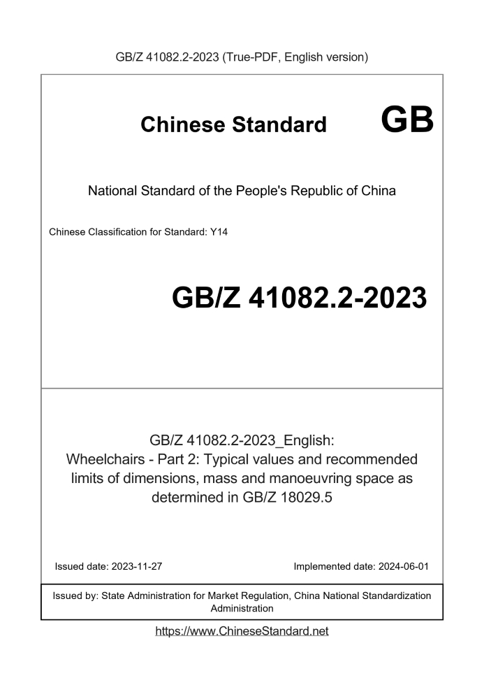 Delivery: <= 6 days. True-PDF full-copy in English will be manually translated and delivered via email. GBZ41082.2-2023: Wheelchairs - Part 2: Typical values and recommended limits of dimensions, mass and manoeuvring space as determined in GB/Z 18029.5 Status: Valid
