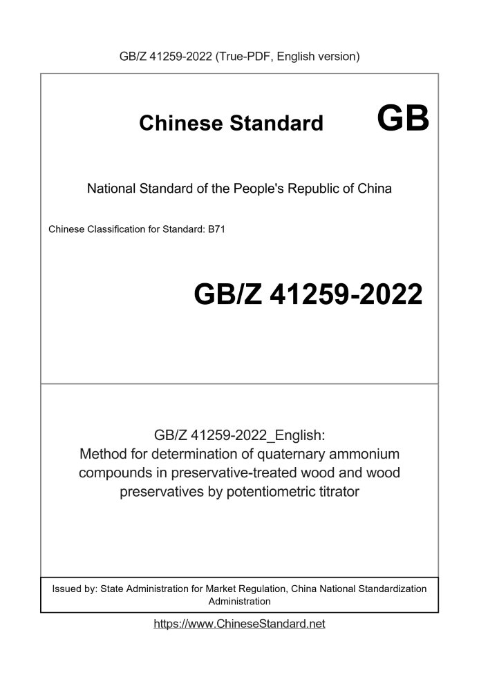 Delivery: <= 3 days. True-PDF full-copy in English will be manually translated and delivered via email. GBZ41259-2022: Method for determination of quaternary ammonium compounds in preservative-treated wood and wood preservatives by potentiometric titrator Status: Valid