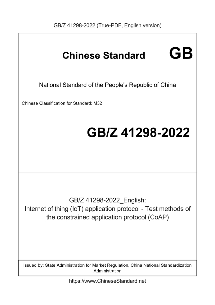 Delivery: <= 4 days. True-PDF full-copy in English will be manually translated and delivered via email. GBZ41298-2022: Internet of thing (IoT) application protocol - Test methods of the constrained application protocol (CoAP) Status: Valid
