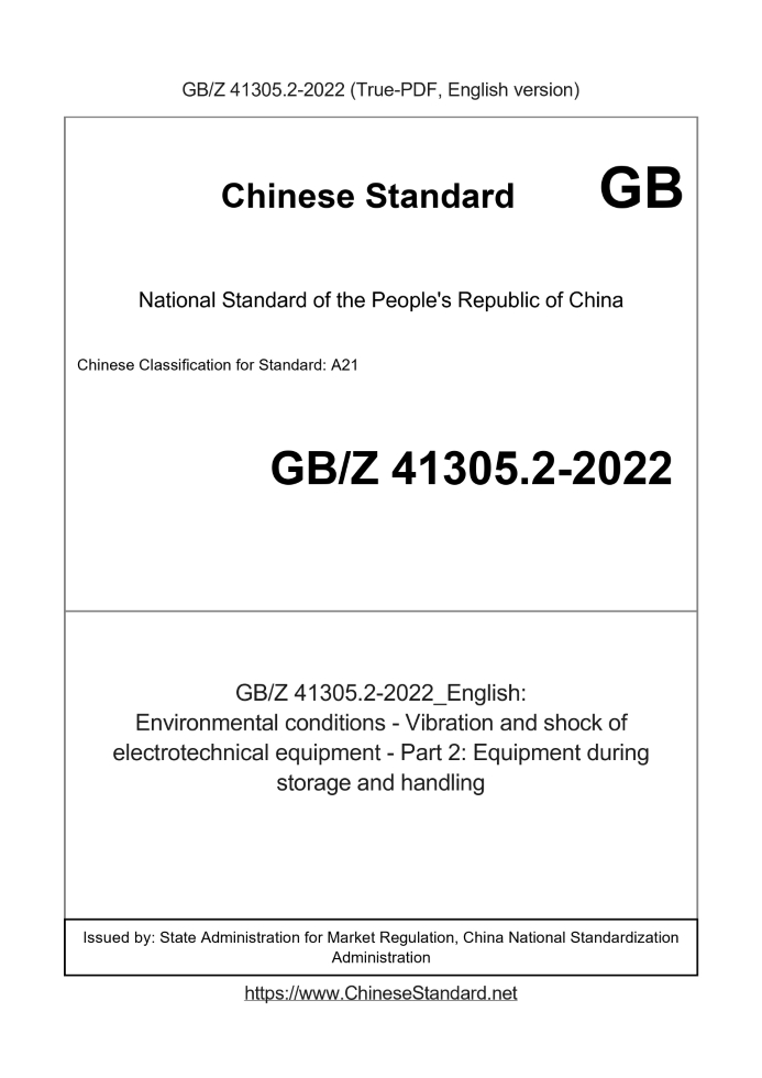 Delivery: <= 7 days. True-PDF full-copy in English will be manually translated and delivered via email. GBZ41305.2-2022: Environmental conditions - Vibration and shock of electrotechnical equipment - Part 2: Equipment during storage and handling Status: Valid